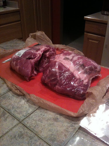 We also threw a Pro Bowl party since my last post. It was a lot of fun to have our friends over to the house, eat some kalua pig, drink some Mai Tais and make the most pointless NFL game of the year fun. We had a pretty good turn out (Us, Brandon, The Gossetts, Jameson, Kevin, Lauren and Mindy) and the food was a hit. So much so, in fact, that we cooked the other half of the giant pork butt to take over to Brandon’s for the Super Bowl π Seriously, look at the size of this thing: