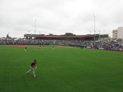 We headed down to Scottsdale Stadium under ominous skies. Knowing that we may get rained out, we parked at a park about 10 minutes (by foot) away so that we wouldn’t have to pay for parking. The Stadium is tiny and has bleachers on the outfield seating. We had lawn seats so we made our way to the lawn with rain misting us. By the time we got settled it was drizzling.