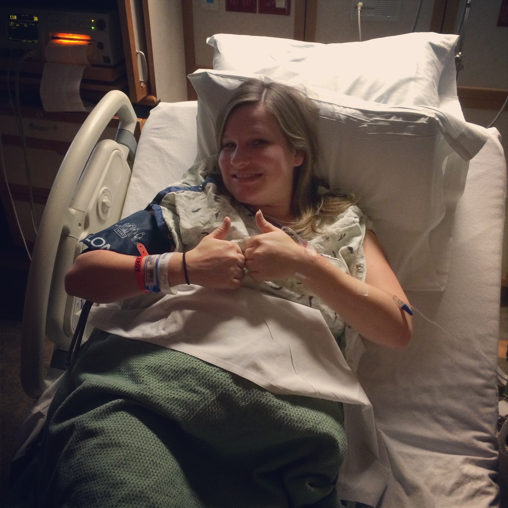 After that completely unexpected news we headed over to emergency for the testing. Shelly, our nurse, hooked me up to a blood pressure cuff and fetal monitoring device. The cuff took my blood pressure every 10 minutes and we got to listen to Baby’s heartbeat and track contractions. Which I was having without even knowing it. They took a urine sample to test my protein levels (a common sign of pre-eclampsia) and blood to check kidney and liver functions as well. We ended up being there for a couple hours with my blood pressure alternating from kind of high for two times and then just fine two times. This pattern continued most of the time.