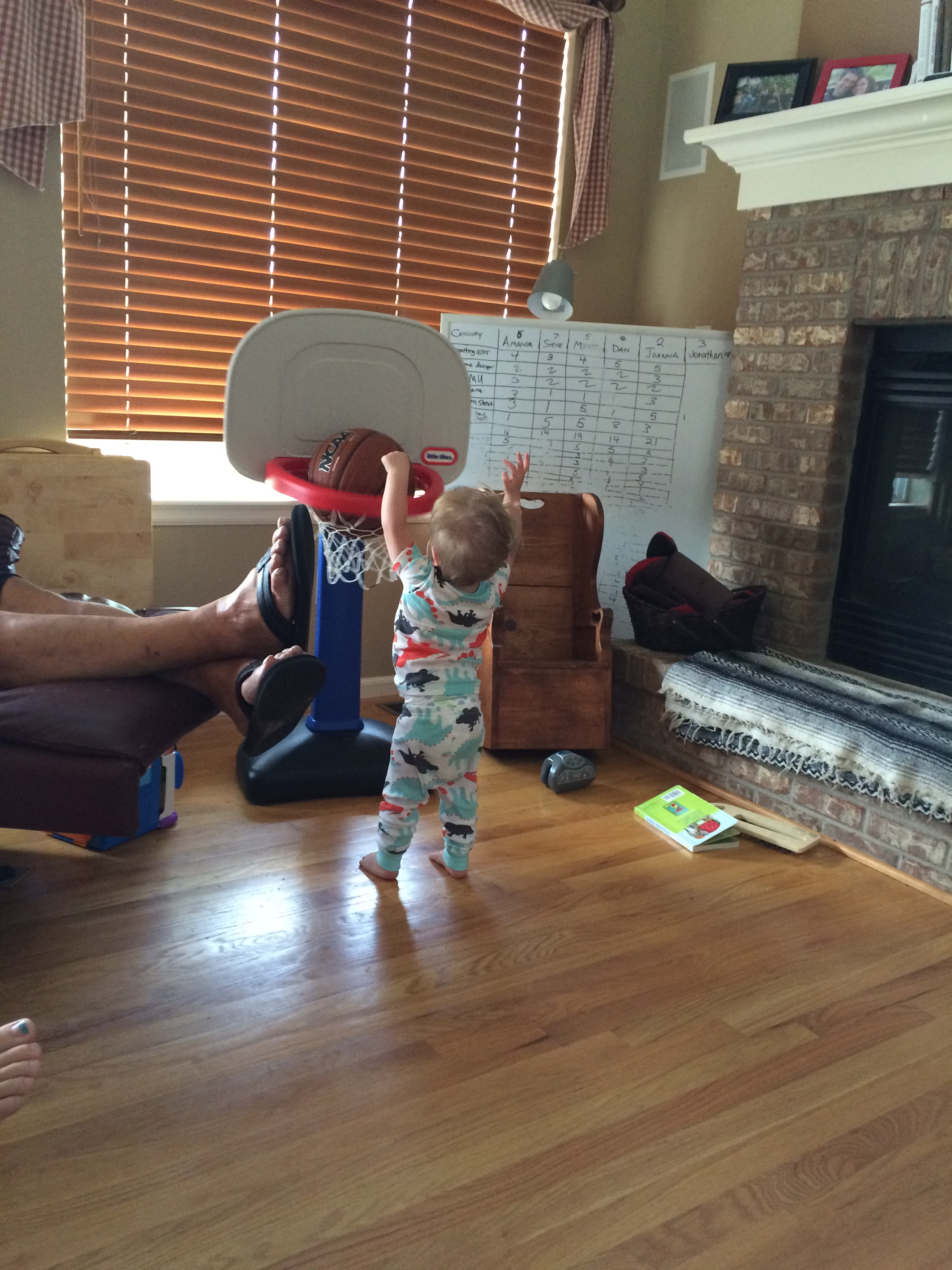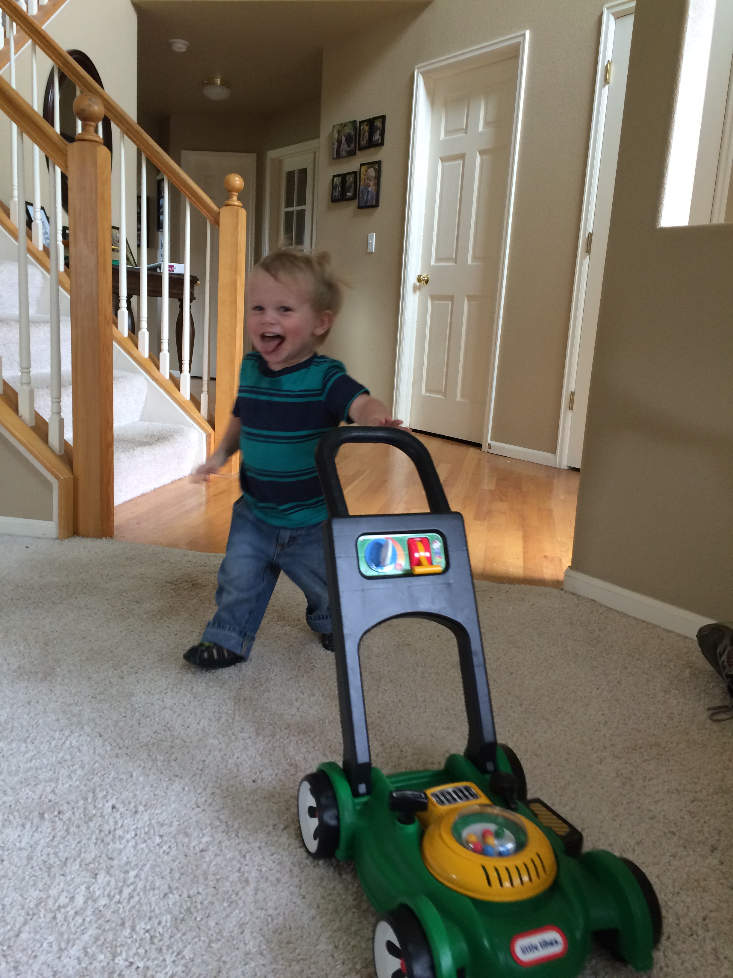 He walks, he runs, he tries to jump and dribble. He throws extremely well (though not always the things I would like him to throw). He mows the carpet and hardwood with his toy lawnmower. He plays his toy piano and loves listening to Baby Mozart, Beethoven and Bach. He can “count” to 3 (he knows how to repeat one, two, three, at times while moving objects). He has mastered the stairs by crawling, walking and sliding down. He likes to hand me pots and pans when I’m cooking. He figured out how to unwrap a Hershey’s Kiss on the first try. “The Wheels on the Bus” mesmerizes him. When we put him to bed at night, he says “bye” and blows us kisses (talk about melting your heart).