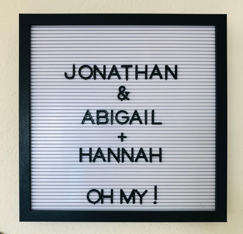 We also wrestled with the question, “Are we officially a Biblical name family, or will we branch out to names invented in the last 2000 years?” Now don’t get me wrong, we clearly have no issue with Biblical names, but I feel like two kids could be a coincidence, three is a decision. I feel the same about same letters – if you had a Joshua and a James, for instance, that could be a coincidence that you just liked those names. If the third is Jessica, you’re an official J namer.