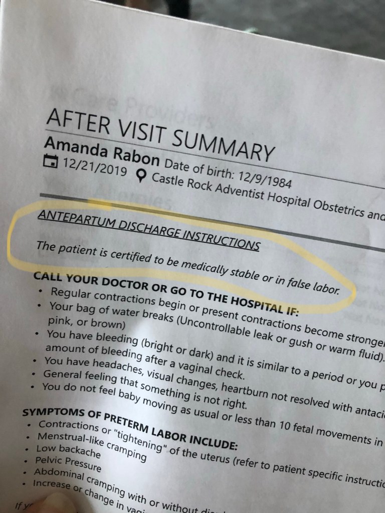 She continued on to tell me that I should come back when I’m actually in labor, which would obviously be way more intense than what I was feeling. I told her I was feeling a lot of pressure in my back and she proceeded to tell me that the problem was probably that she was upside down and her head was hitting the wrong spot to dilate me further (first time anyone had mentioned her being upside down). She suggested a few positions to get in to turn her the right way. She told me she’d expect me to be back in 2-3 days to have the baby. She also mentioned that if I really couldn’t handle it that I could come back and request to be put in a morphine sleep while I was in early labor so that I would be in the hospital when I actually went into labor. I asked her what I should be looking for since I was clearly within the 5-1-1 category, and she told me it would hurt 10x worse. Meanwhile, all I’m thinking is… if this isn’t true labor, I won’t be able to make it.